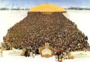Remembering meditating with 7,000 people for 3 weeks, almost 30 years ago. the Happiness Index rose and the Suffering Index fell. It could happen again. Any time. I’m in the red beret, on the left, about 900 rows back.